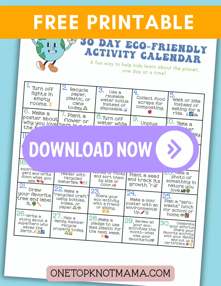 I created this 30-Day Eco-Friendly Activity Calendar that’s packed with simple, doable challenges kids actually want to try:
