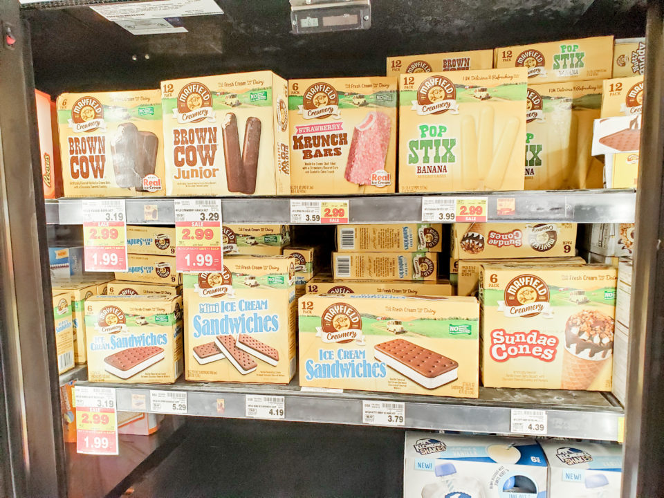 These were found in the ice cream aisle at our neighborhood Kroger! Great prices and awesome variety of flavors. They also had plain ice cream cartons too. It pays to stock up on these treats!
