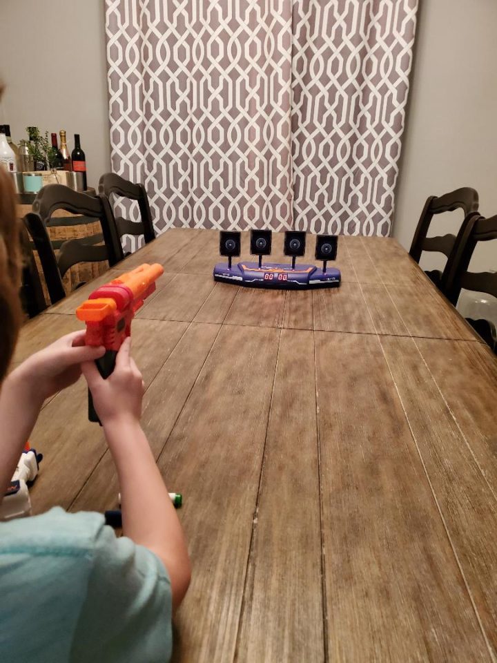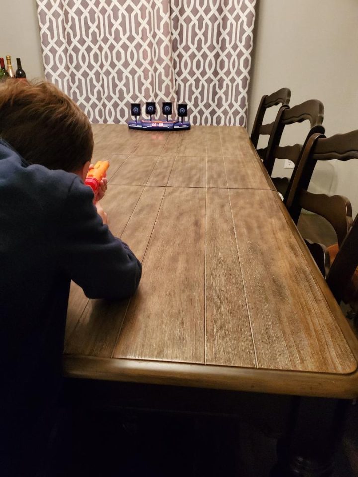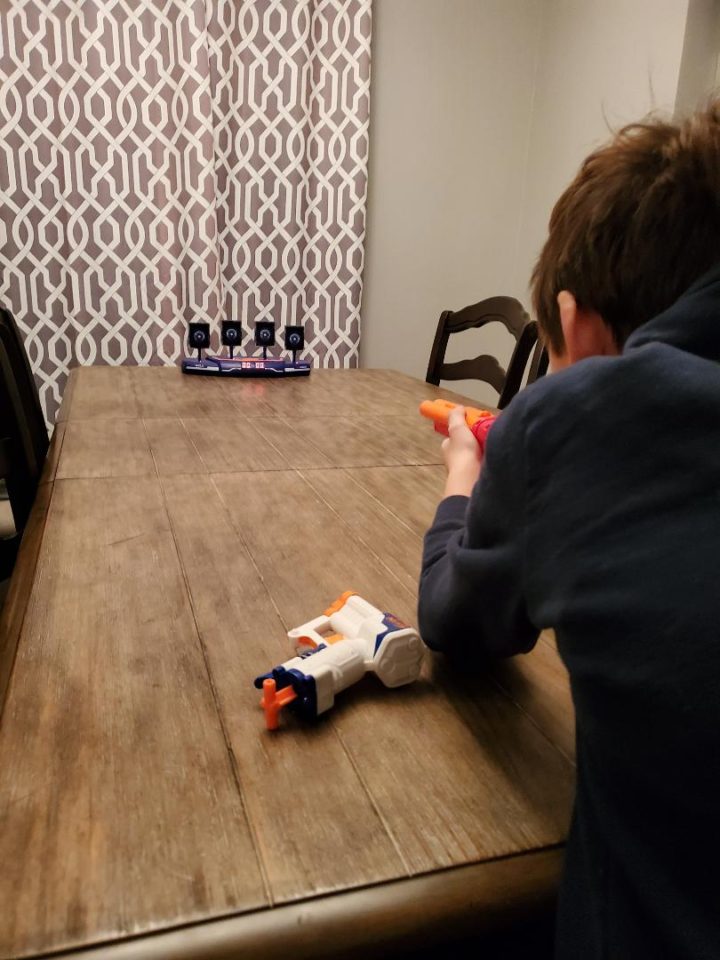 With that said, they received this Nerf Gun target game for Christmas, and we set it up the other day to see how they liked it. We set it up at the end of the dining table and told them the rules as a reminder.