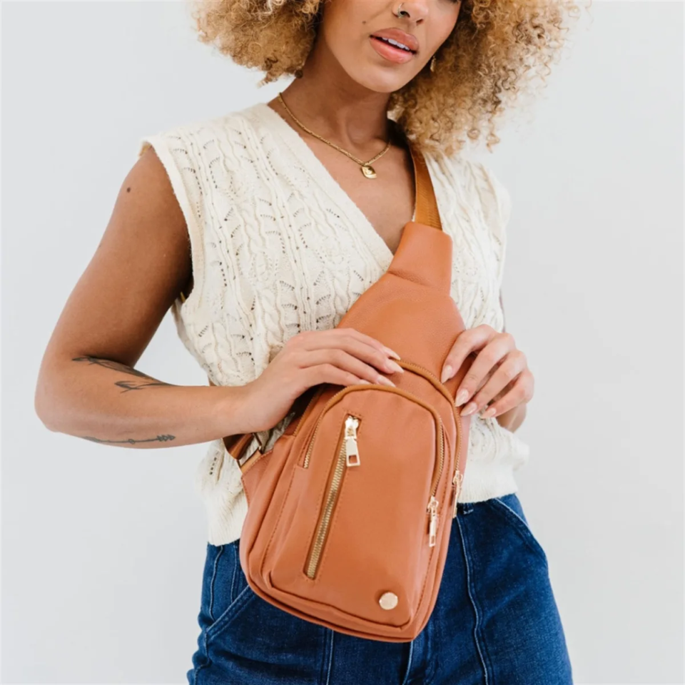 The Camry Sling Crossbody keeps your must-haves easily accessible and totally organized! It comes in four great neutral colors made from silky-soft vegan leather, complete with gold hardware.